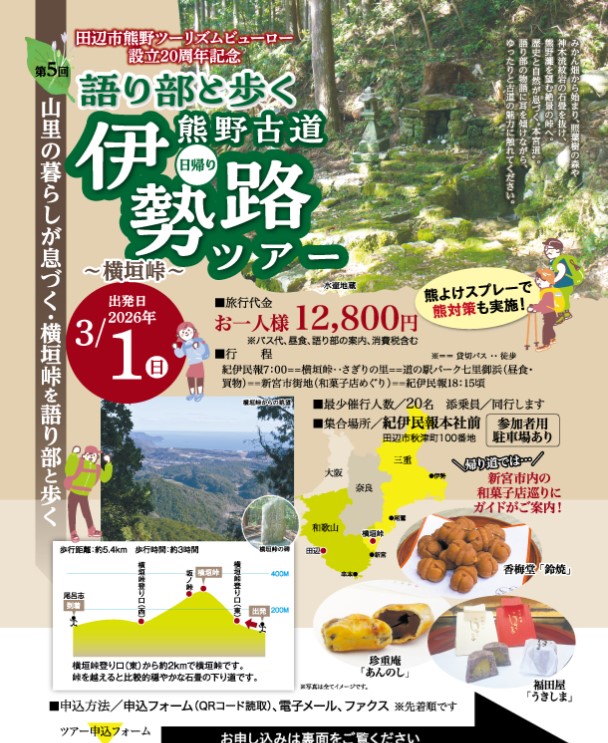 田辺のビューローさんで企画を行ってまして、「語り部と歩く熊野古道伊勢路ツアー 横垣峠」です。